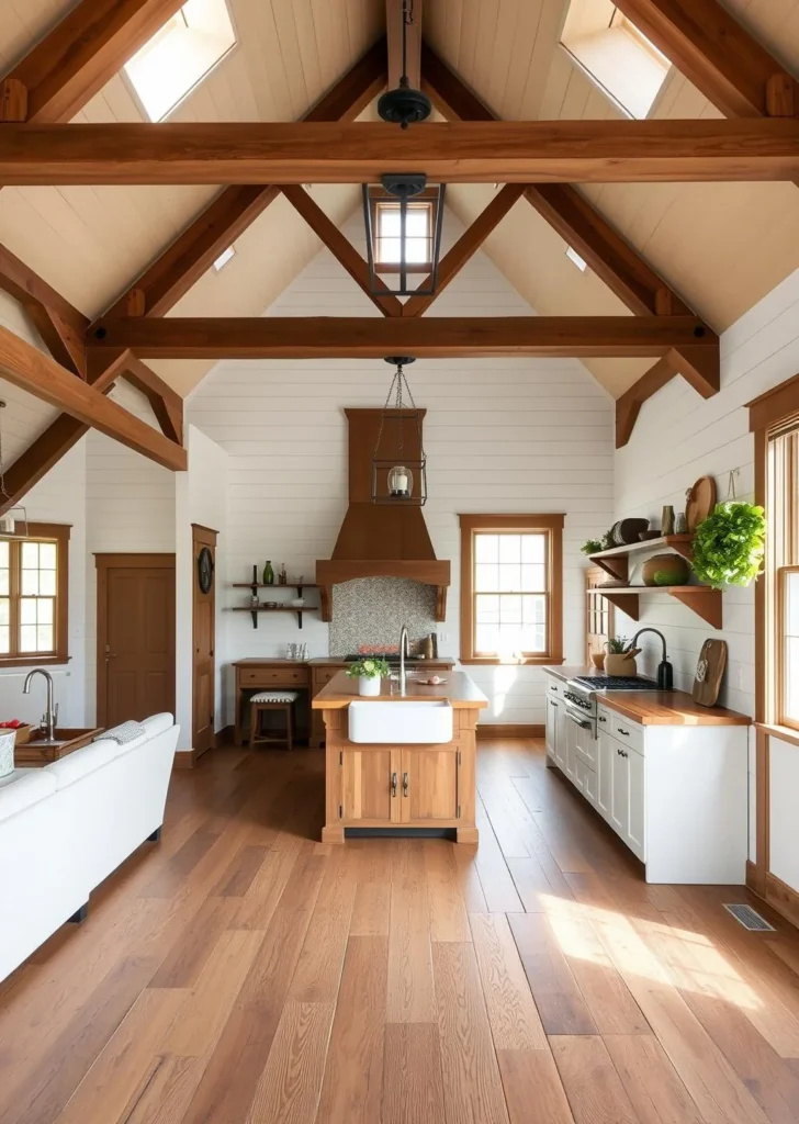 For a cozy and inviting feel, a farmhouse-inspired open floor plan is a fantastic choice. This style combines rustic charm with modern functionality. Exposed beams, shiplap walls, and reclaimed wood flooring create a warm and welcoming atmosphere. The kitchen is often the heart of the home, featuring a large farmhouse sink, butcher block countertops, and a rustic range. Comfortable seating arrangements and layered textiles add to the overall cozy vibe.