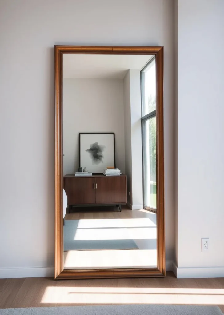 A full-length mirror or circular wall mirror amplifies light and makes rooms feel larger.