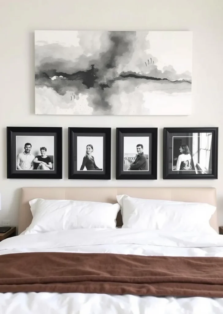 - Gallery Wall: Black-and-white photos in matching frames.