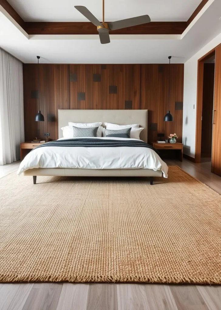 A large, low-pile rug under the bed ties the room together. Jute or wool blends add natural texture.